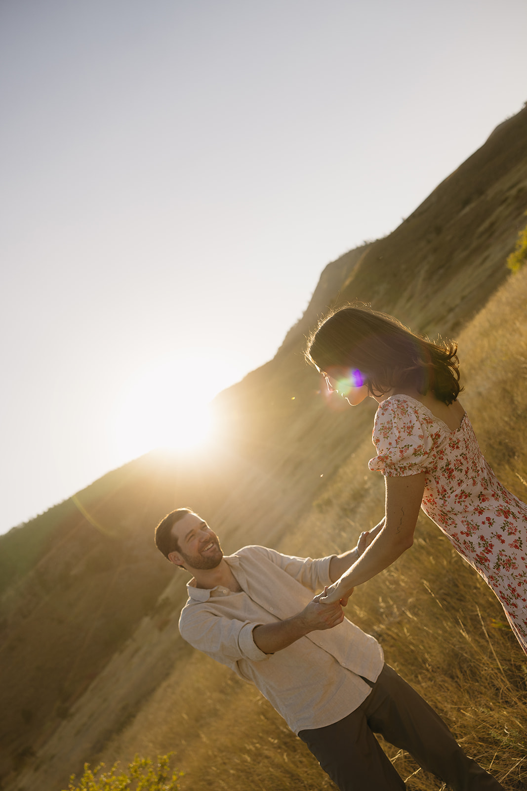 Spring engagement photos feel their best when they’re not forced. A gentle spin, pulling each other closer when the wind picks up, sunlight wrapping around you at golden hour — those are the details that make images feel candid and emotional.